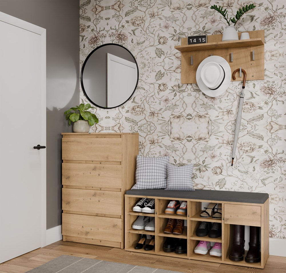 Szafka na buty TALLIN to praktyczny i stylowy mebel, który świetnie odnajdzie się w każdym przedpokoju. W wersji kolorystycznej dekoru dąb artisan prezentuje się elegancko i ciepło jednocześnie – pasując zarówno do nowoczesnych wnętrz, jak i tych w bardziej klasycznym stylu.