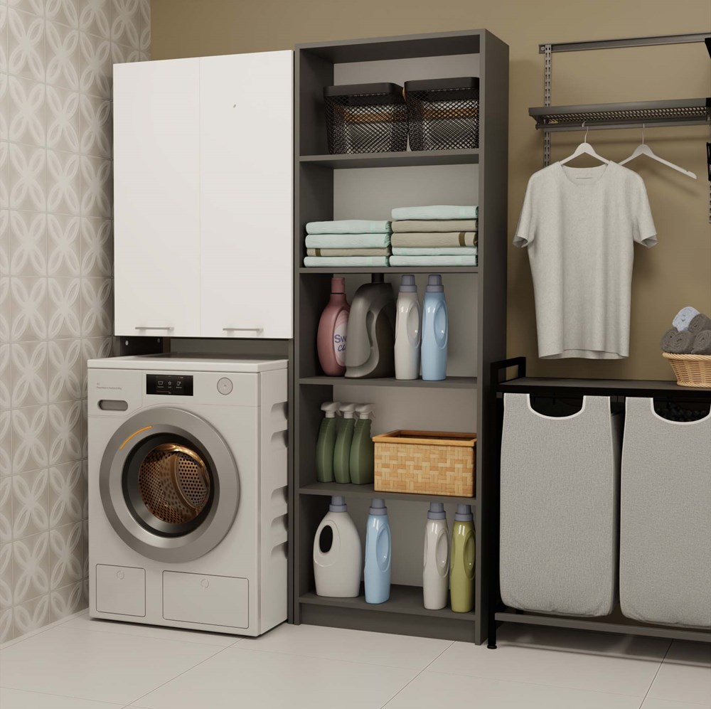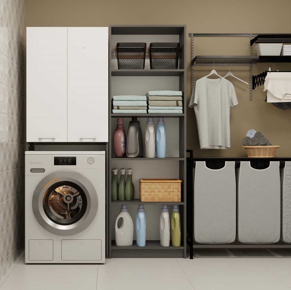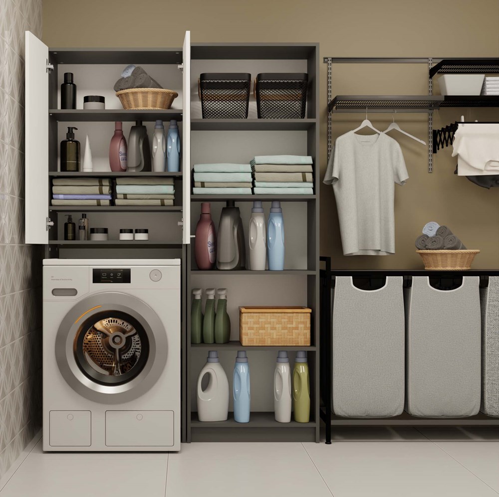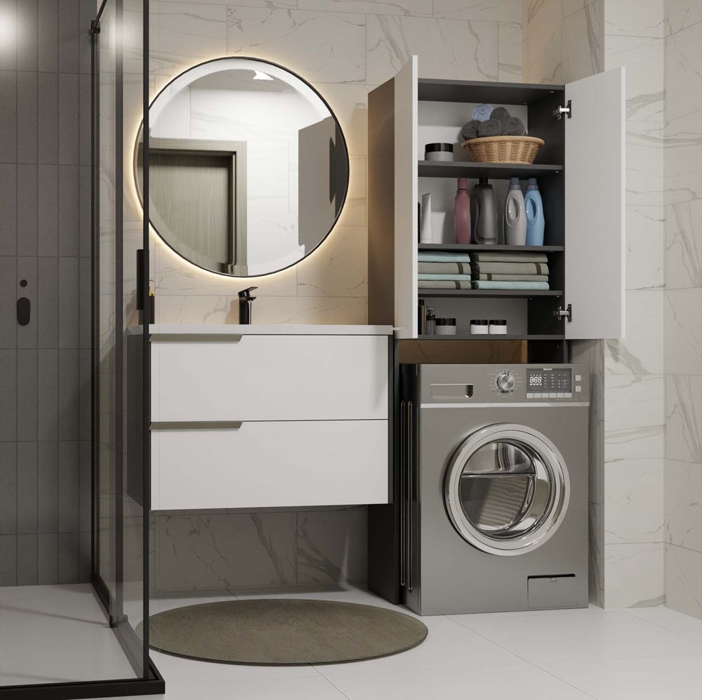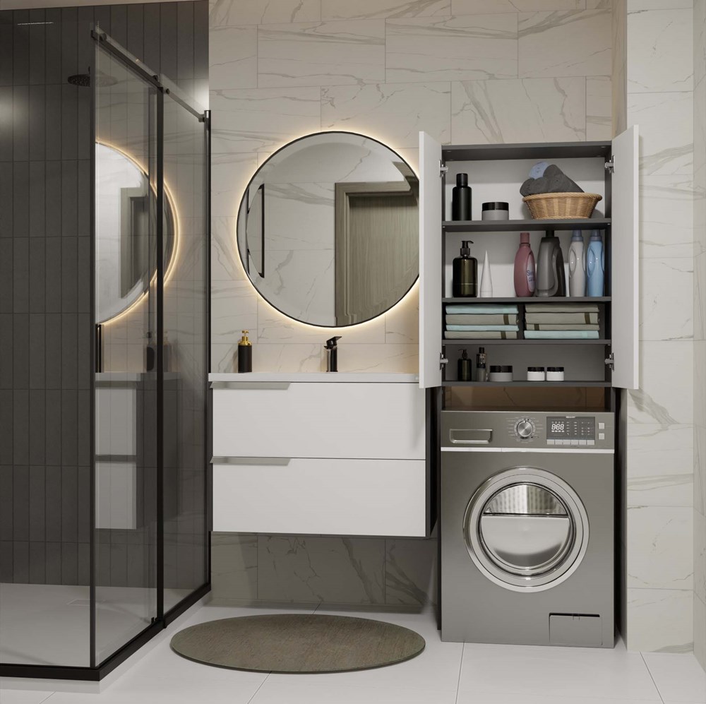 - 4 pojemne półki schowane za drzwiami – idealne na ręczniki, detergenty i akcesoria.