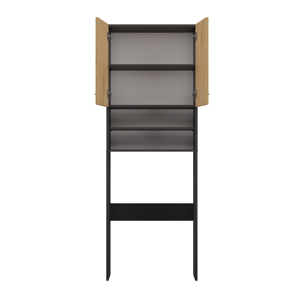Szafka posiada 2 półki schowane za drzwiczkami oraz 2 półki odsłonięte.