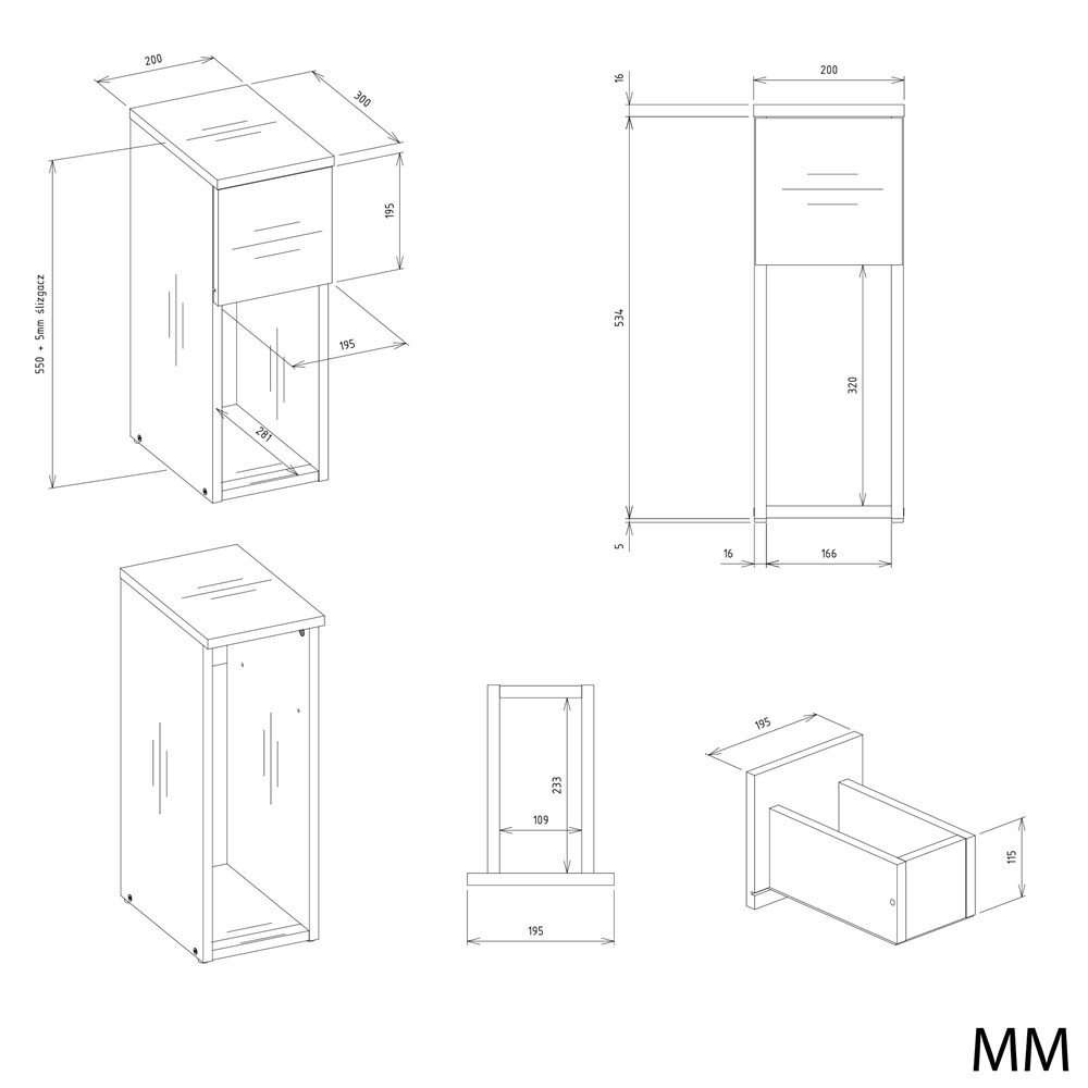 - Korpus i front – płyta wiórowa laminowana o grubości 16 mm.