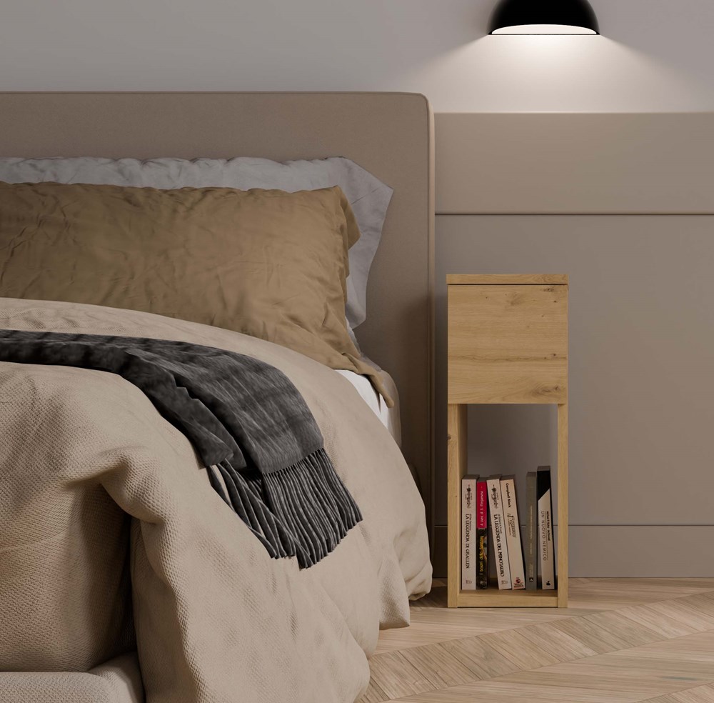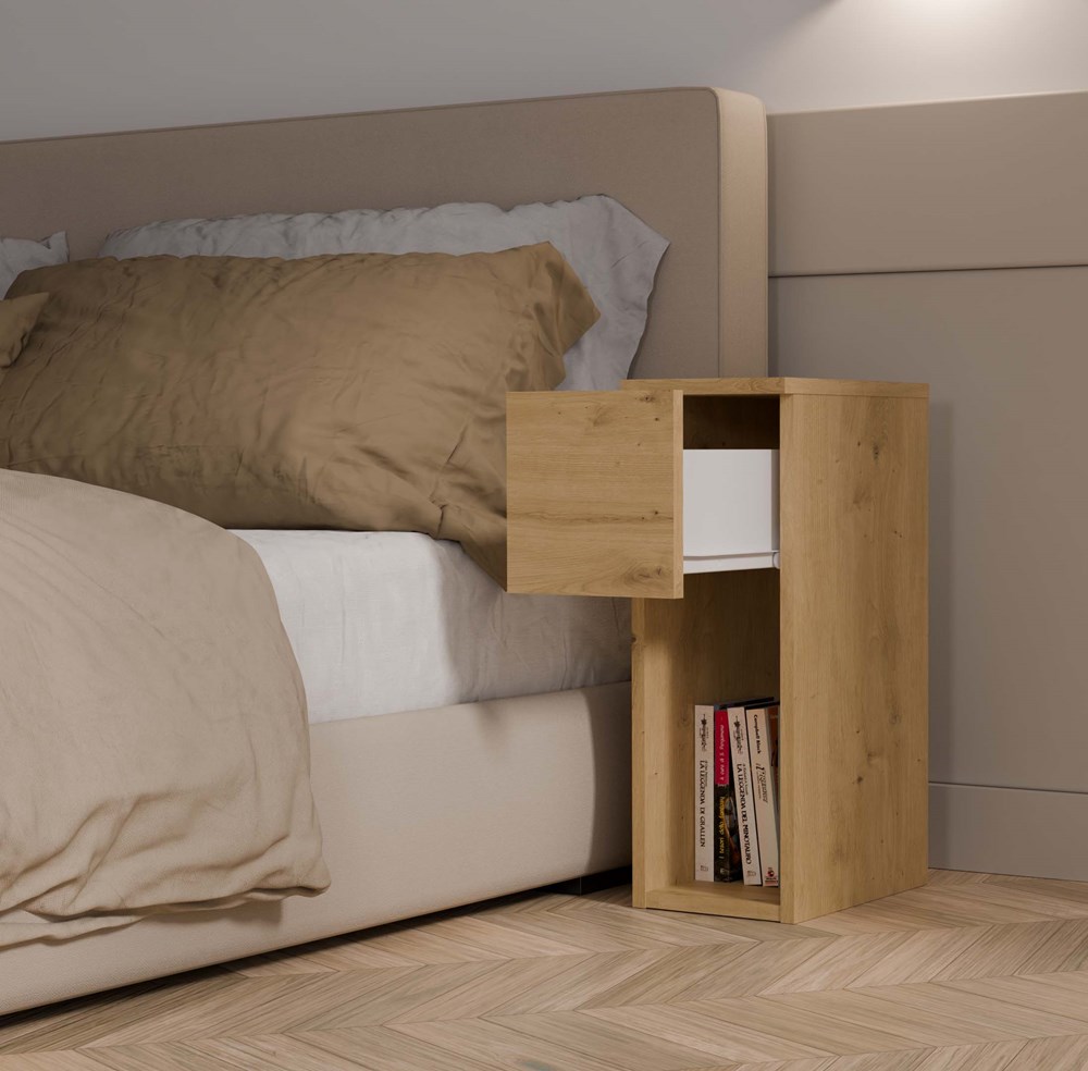 - Szuflada oraz otwarta półka – idealne do przechowywania najpotrzebniejszych rzeczy, takich jak telefon, ładowarka, książka czy okulary.