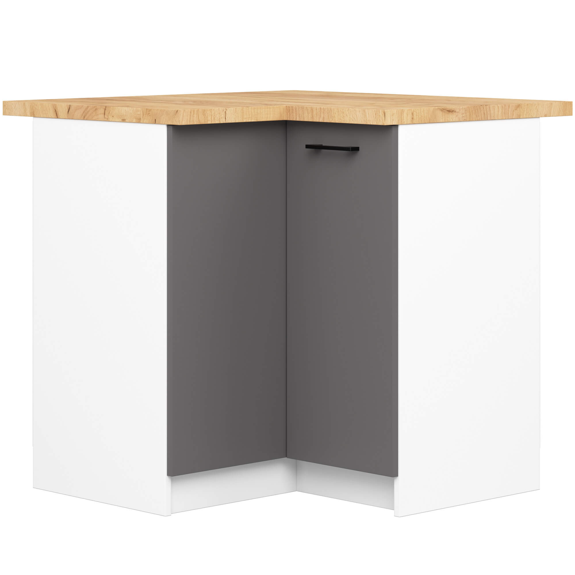 Kuchnia to pomieszczenie będące sercem każdego domu. To właśnie tutaj domownicy codziennie przygotowują liczne posiłki, oddając się rozmowom oraz spędzając razem czas. Nic więc dziwnego, że każdy chce swoją kuchnię urządzić w sposób zarówno funkcjonalny, jak i przyjemny dla oka. Meble pochodzące z kolekcji Oliwia z pewnością w tym pomogą. Prezentujemy jeden z elementów pochodzących właśnie z tego zestawu modułowego – szafkę narożną S90/90N zaprojektowaną w modnym kolorze białym wraz z frontami grafit szary, z którym doskonale kontrastują czarne, matowe uchwyty, tworząc niepowtarzalną całość. Elegancki mebel umożliwia otworzenie drzwiczek na prawą oraz lewą stronę, dzięki czemu możliwe jest uzyskanie swobodnego dostępu do dużej przestrzeni, w której można umieścić wiele artykułów niezbędnych w każdej kuchni, środków czystości czy produktów spożywczych.