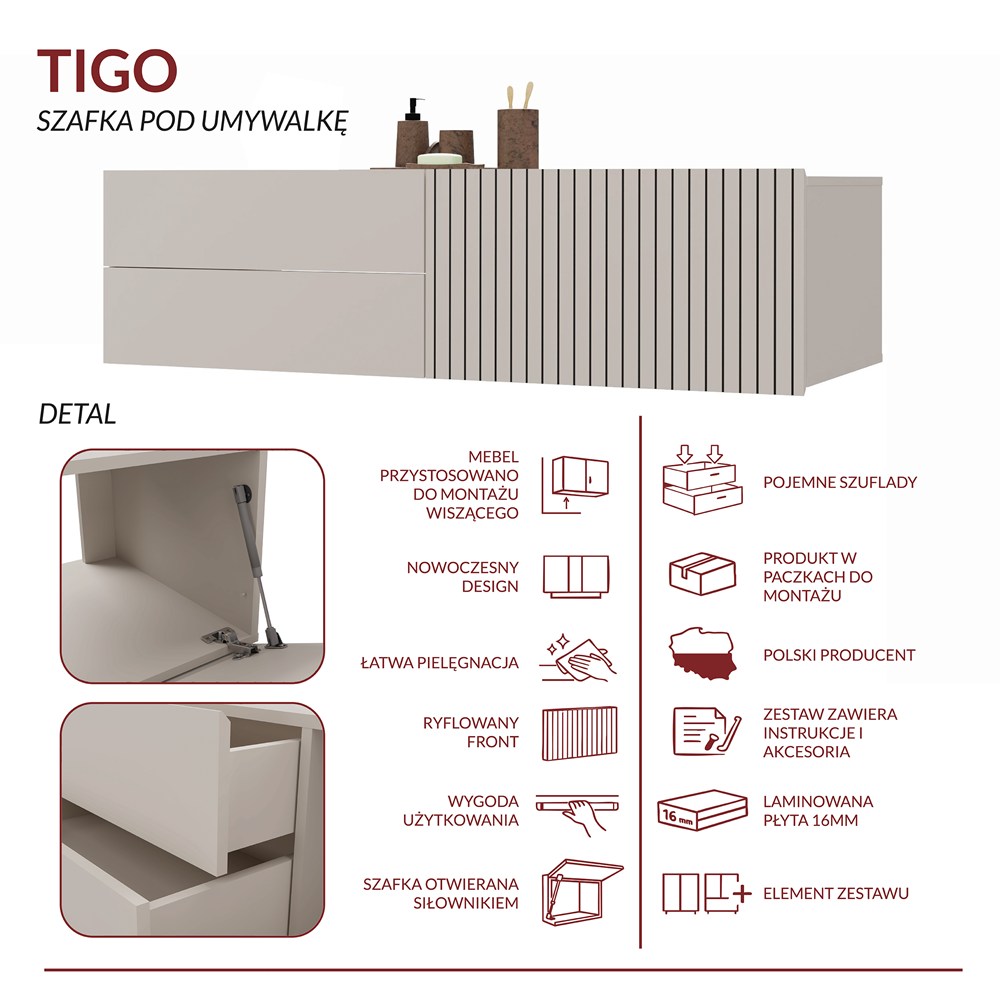 SZAFKA POD UMYWALKĘ TIGO 1D2S KASZMIR 140 CM 2 SZUFLADY RYFLOWANY FRONT WISZĄCA
