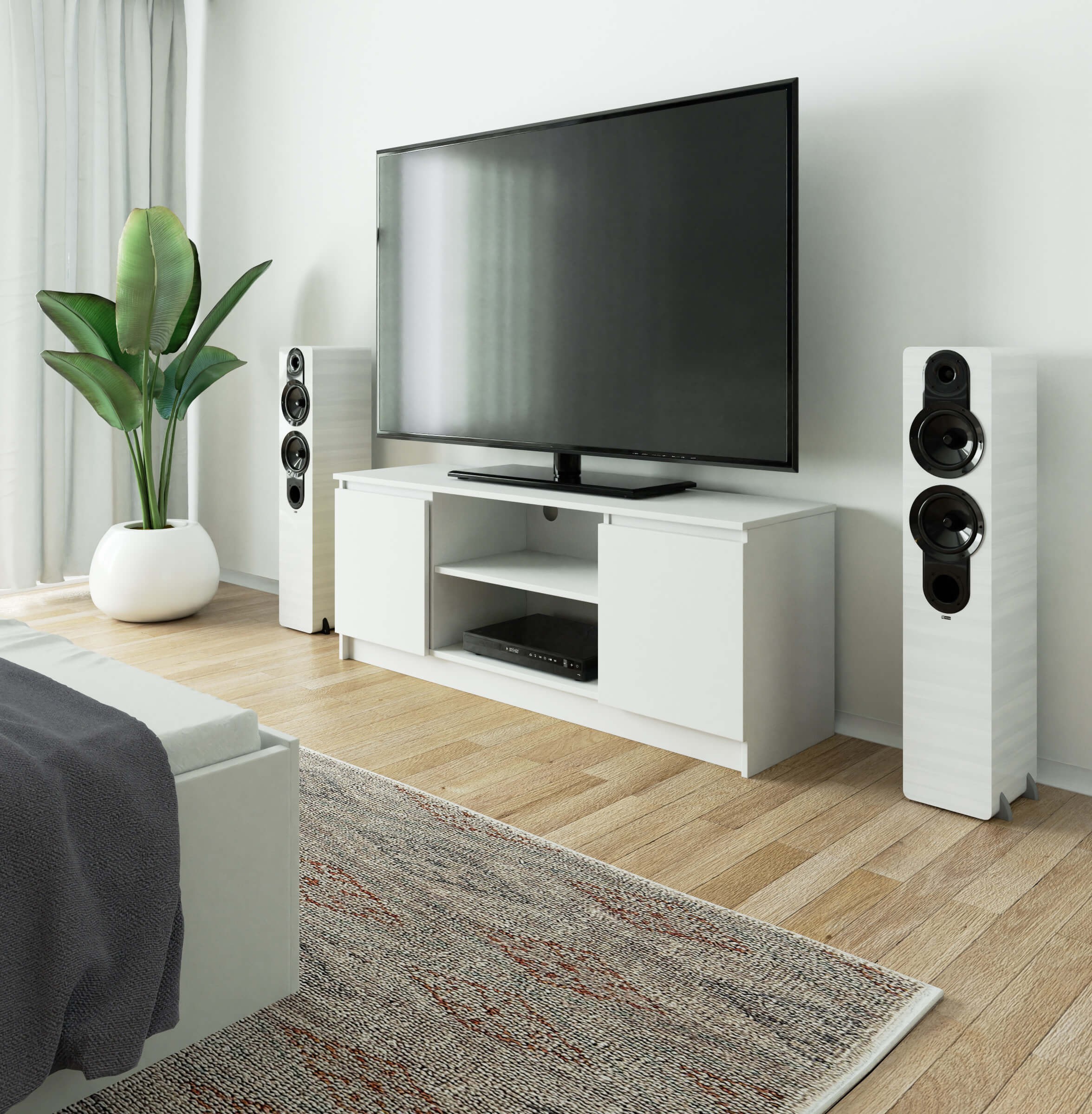 Szafka RTV K140 to idealny wybór dla każdego, kto szuka stabilnej i estetycznej komody pod telewizor. Wyposażona w półkę oraz dwie szafki drzwiowe, pomieści wszystkie sprzęty elektroniczne i inne drobiazgi, które chcemy mieć pod ręką – jej wymiary zostały dostosowane do najpopularniejszych na rynku dekoderów, konsol czy sprzętu audio. Dzięki uniwersalnemu, nowoczesnemu designowi i pięknemu, białemu kolorowi szafka doskonale sprawdzi się w pomieszczeniach o różnych wystrojach. Polecamy ją w szczególności do wnętrz we wciąż modnym stylu skandynawskim oraz minimalistycznym.