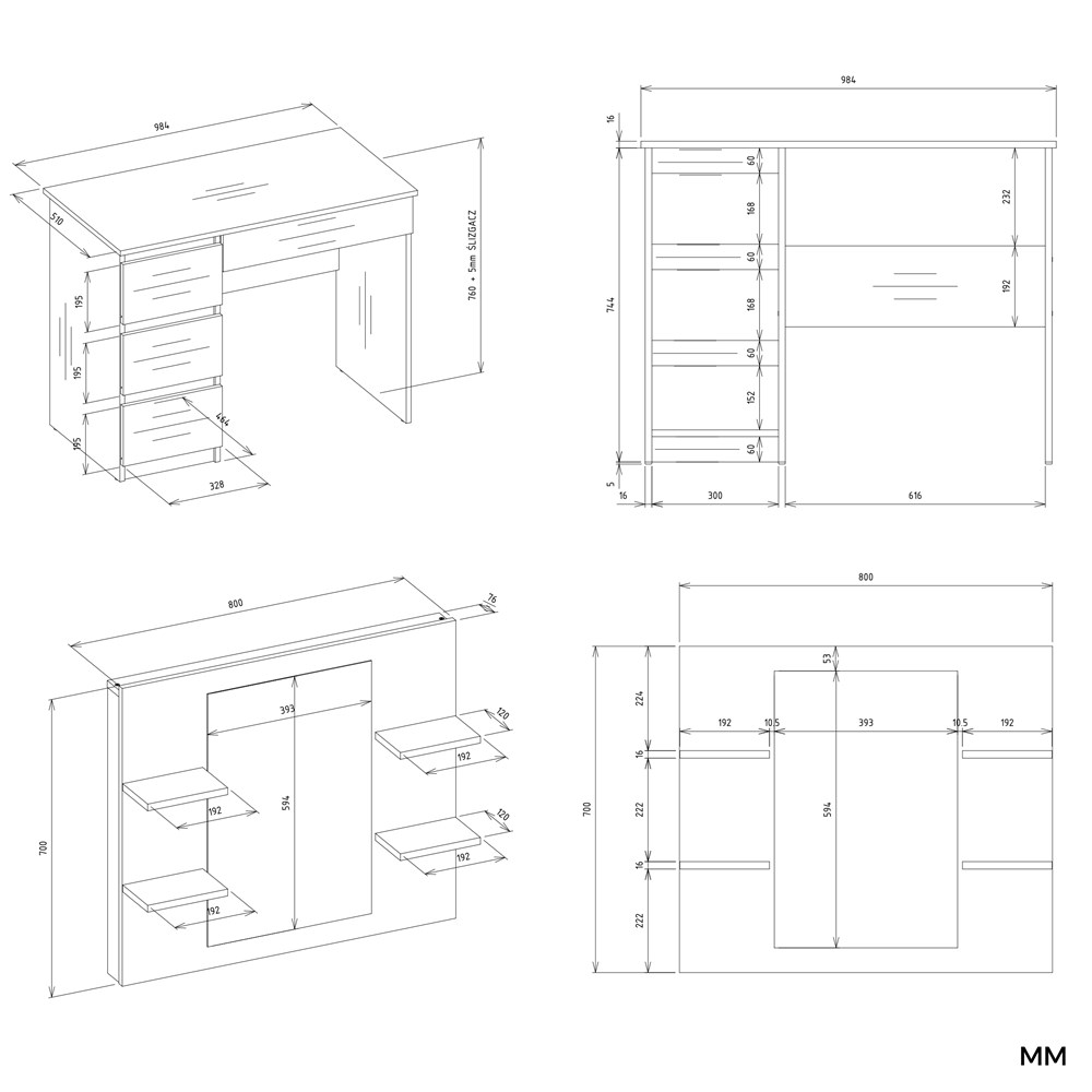 - Szuflady: 4 sztuki (3 po lewej, 1 pod blatem po prawej) na prowadnicach rolkowych – płynne i ciche działanie