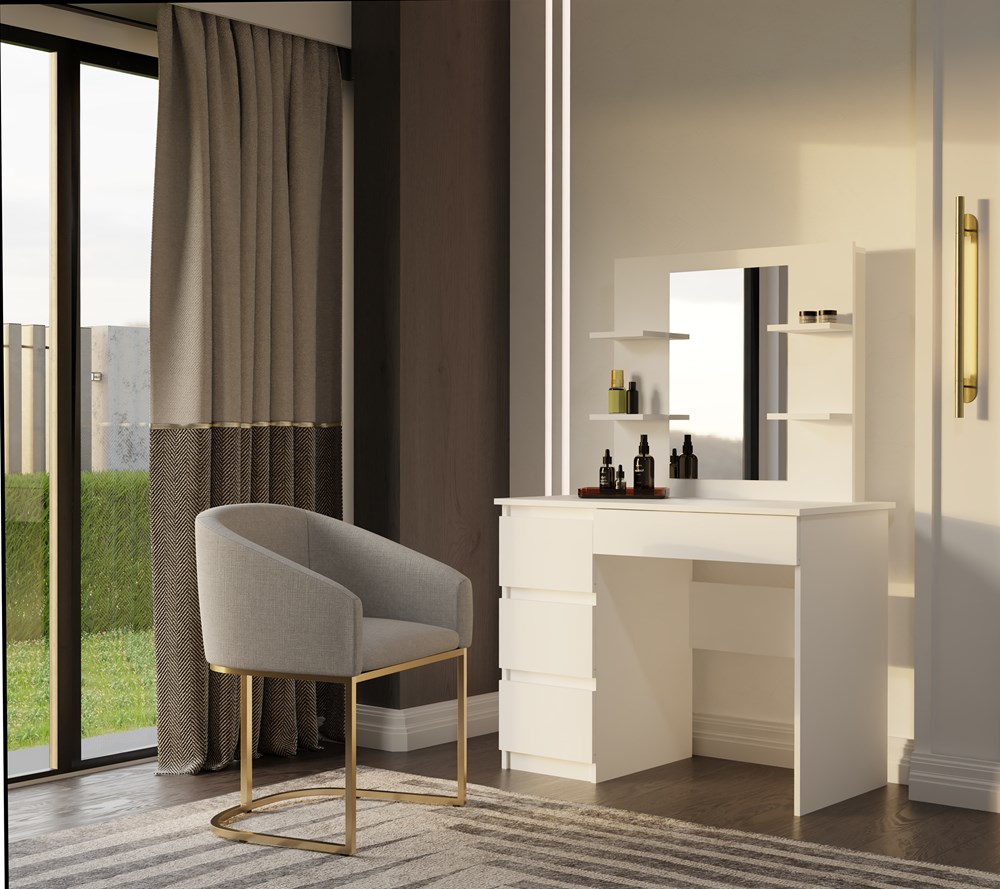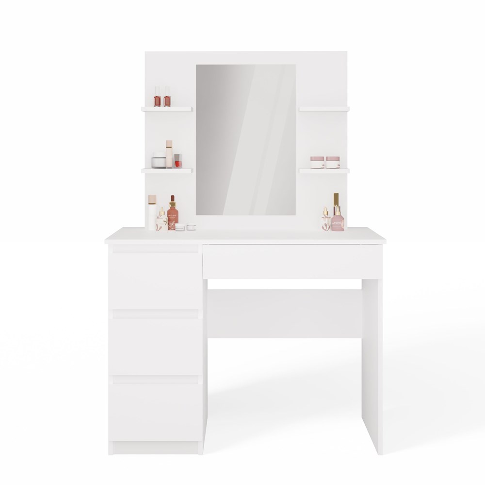 Duże lustro i aż cztery praktyczne półki pozwalają wygodnie przechowywać kosmetyki, perfumy lub biżuterię, a cztery pojemne szuflady pomieszczą wszystkie codzienne niezbędniki.