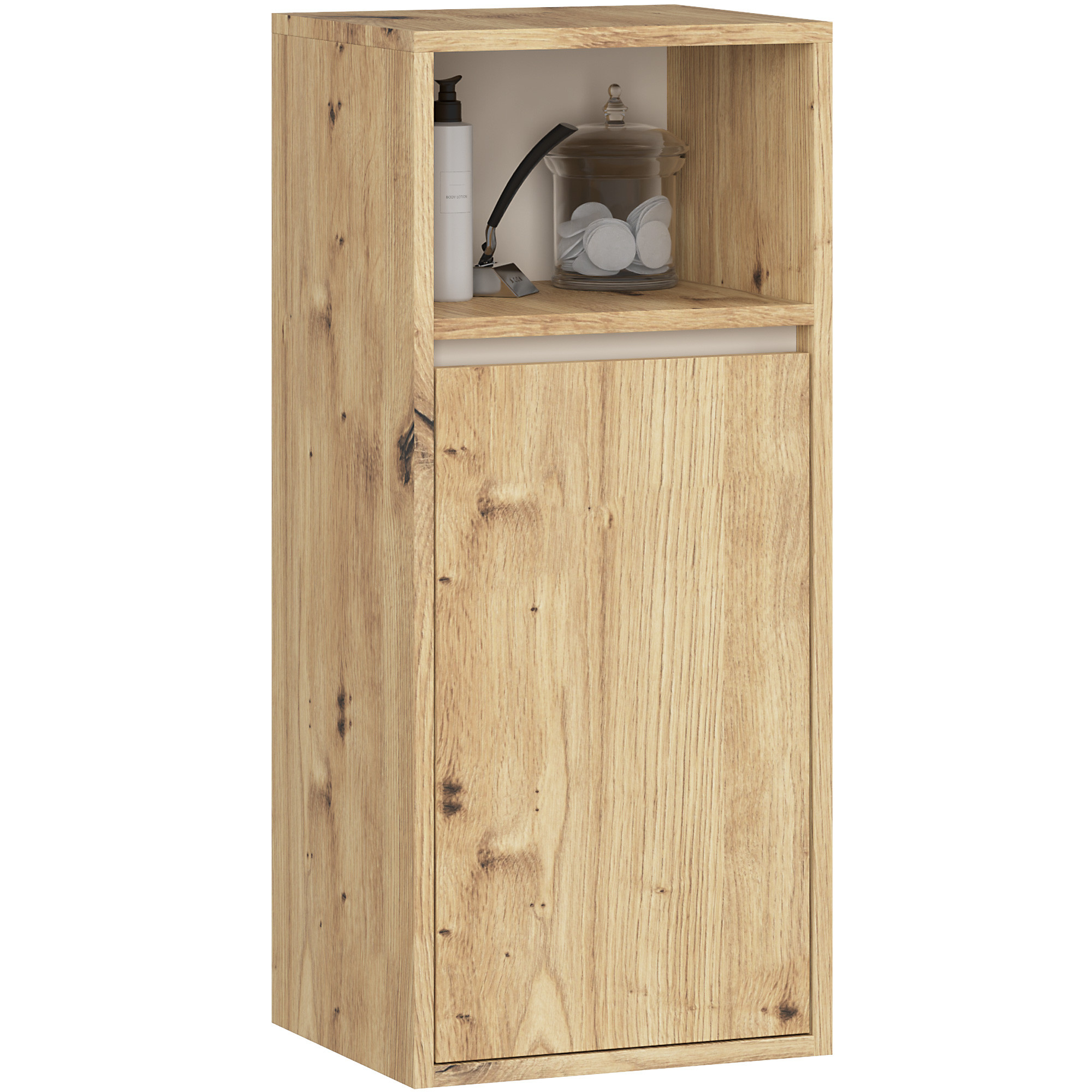 Zestaw mebli do łazienki VAMI z szafką pod umywalkę doskonale wpisuje się w aktualne trendy aranżacyjne. Ciekawy design z półkami otwartymi nadaje łazience przyjemny i stylowy wygląd. Wszystkie szafki wchodzące w skład zestawu są przeznaczone do montażu na ścianie. Zestaw został zaprojektowany tak, aby zapewnić odpowiednio dużo miejsca na kosmetyki, artykuły higieniczne i inne niezbędne w łazience produkty. Opisywany komplet mebli obejmuje: