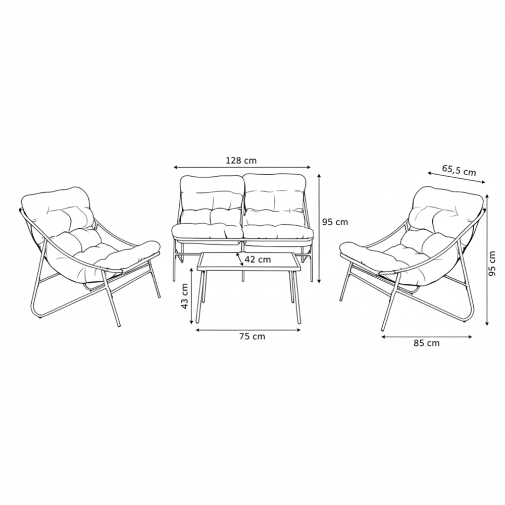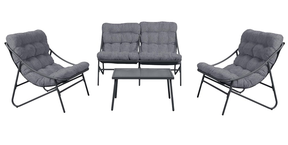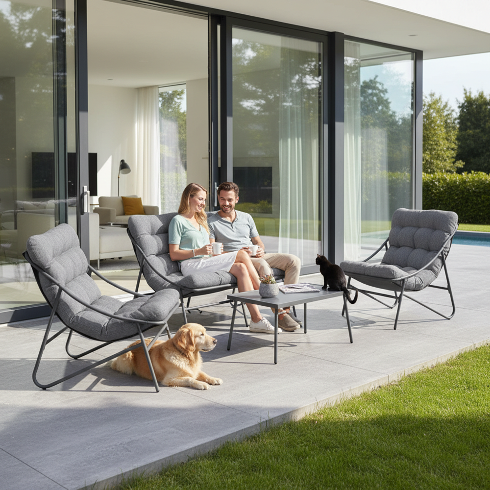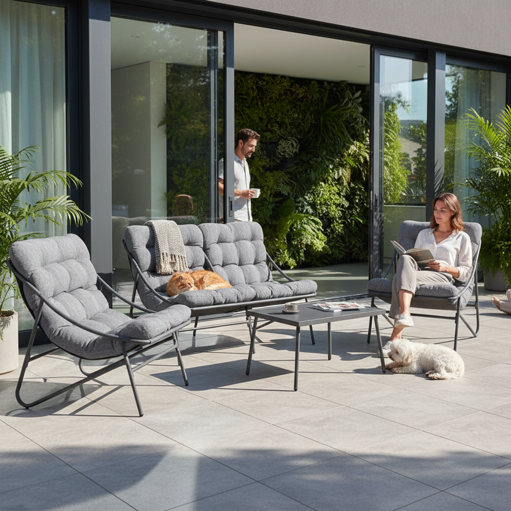 Stylowy komplet wypoczynkowy VIBE to cztery dopasowane elementy, które razem tworzą wygodną i elegancką przestrzeń relaksu. Sprawdzi się zarówno na dużym tarasie, jak i w bardziej kameralnych przestrzeniach – na balkonie czy w ogrodowym kąciku kawowym.