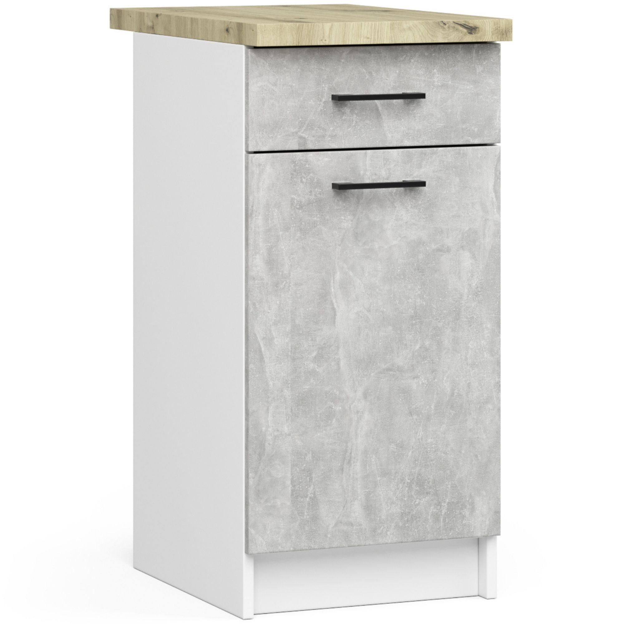 – Szafki wykonane z płyty laminowanej w kolorze białym z frontami w betonie