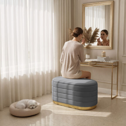 Pufy welurowe z otwieranym siedziskiem zachwycają eleganckim charakterem i podkreślają wyrafinowany styl wnętrza. Gładka, miękka w dotyku tkanina dodaje im