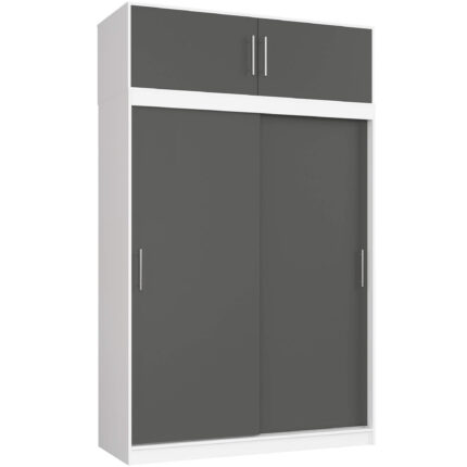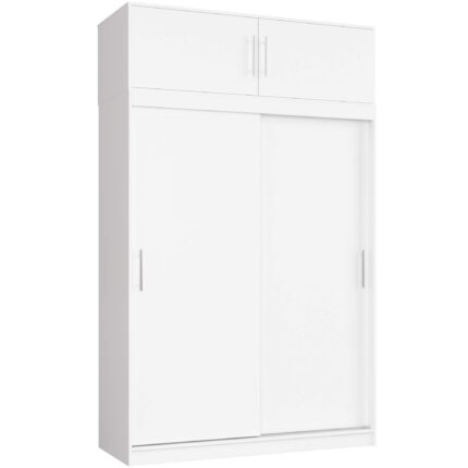 Szafa przesuwna z nadstawką ubraniowa czterodrzwiowa wykonana została z odpornej na ścieranie płyty laminowanej Kronospan. Korpus mebla stanowi płyta w