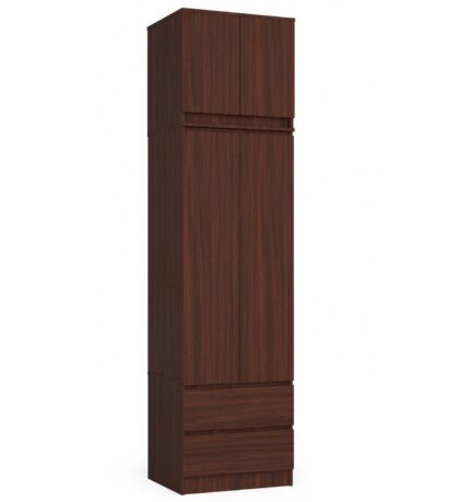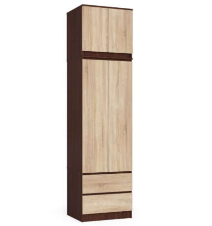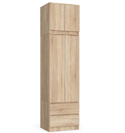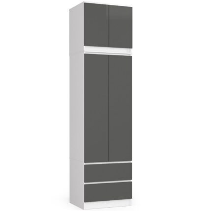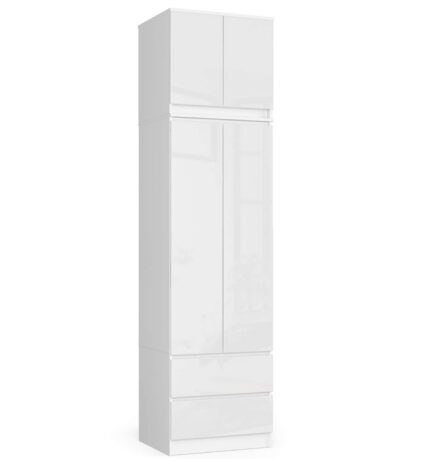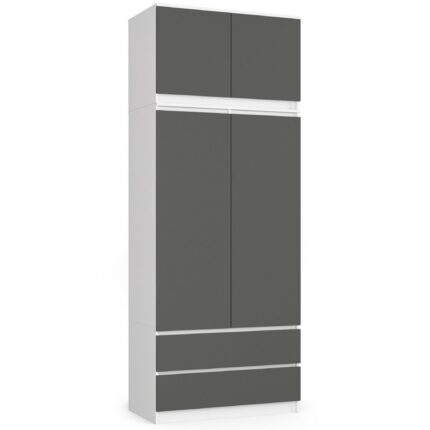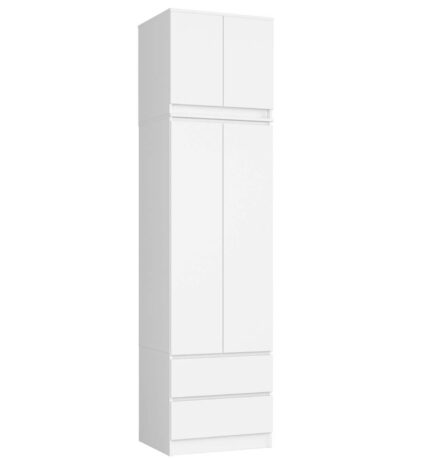 Szafa ubraniowa dwudrzwiowa wykonana została z odpornej na ścieranie płyty laminowanej Kronospan. Korpus mebla stanowi płyta w kolorze białym, natomiast