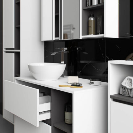 Szafka pod umywalkę nablatową VAMI W90 łączy w sobie nowoczesny design, lekką formę i dużą funkcjonalność. Dwie szuflady pozwalają wygodnie