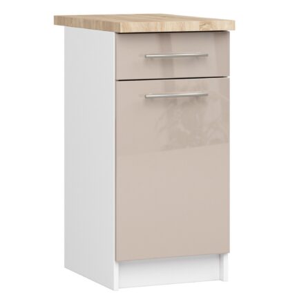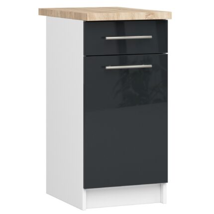 Szafka kuchenna zaprojektowana w modnym kolorze białym, wyposażona w dębowy blat oraz nowoczesne czarne uchwyty zapewniające długie i bezproblemowe użytkowanie,