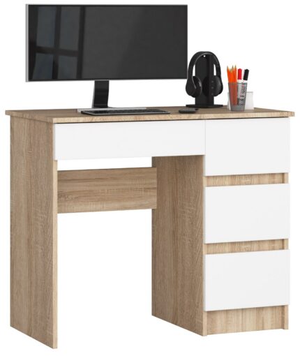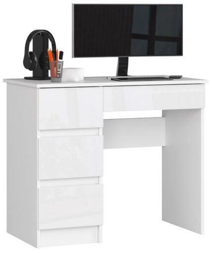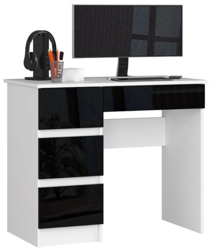 Biurko komputerowe A-7 wykonane zostało z wysokiej jakości płyty laminowanej odpornej na ścieranie. Biały kolor połączony został z czarnymi, połyskującymi