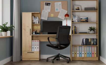 BIURKO Z REGAŁEM COSMO – FUNKCJONALNA PRZESTRZEŃ DO PRACY I PRZECHOWYWANIA MODEL: COSMO Kolor: DĄB ARTISAN Konstrukcja: Biurko z wysokim