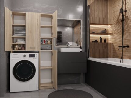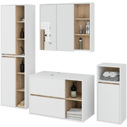 Zestaw mebli łazienkowych VAMI to kwintesencja nowoczesnego stylu. Dzięki otwartym półkom, szafki są lekkie wizualnie i perfekcyjnie wpisują się w najnowsze