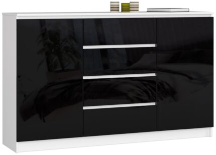 Komoda K 160 cm to mebel o wyjątkowych walorach wizualnych. Uniwersalna czerń frontów wykończonych połyskiem idealnie harmonizuje z półmatem korpusu.
